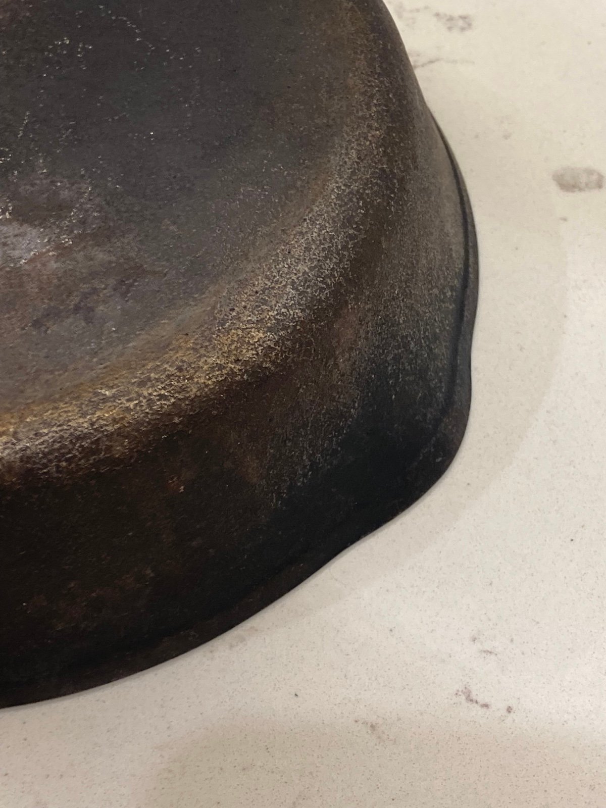 This pan is in good condition for how old it is, it does need a water & baking soda bath and then add vinegar use a sponge to remove all rust and season it with oil at 500 in the oven. Make sure to google how to do it properly or if you know this pan is perfect for you!