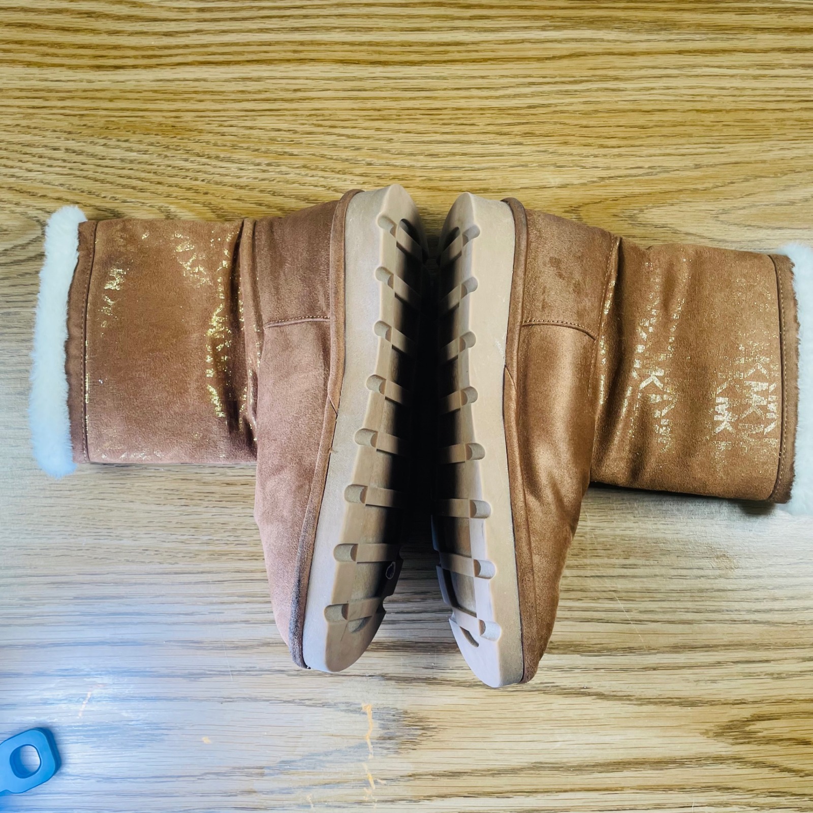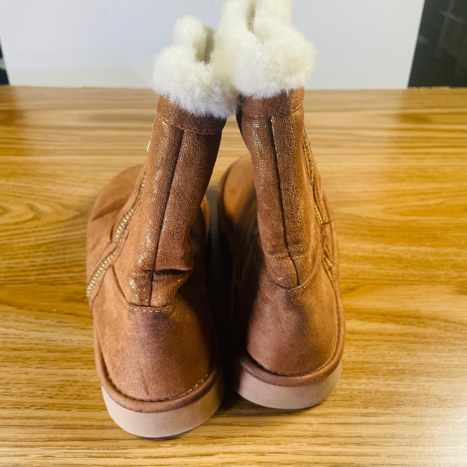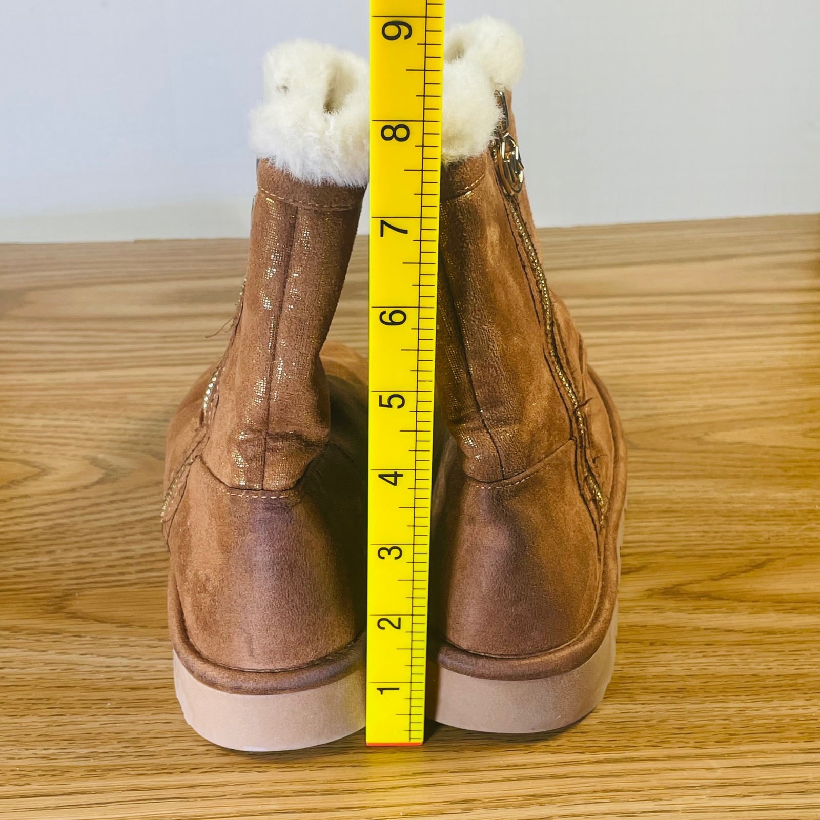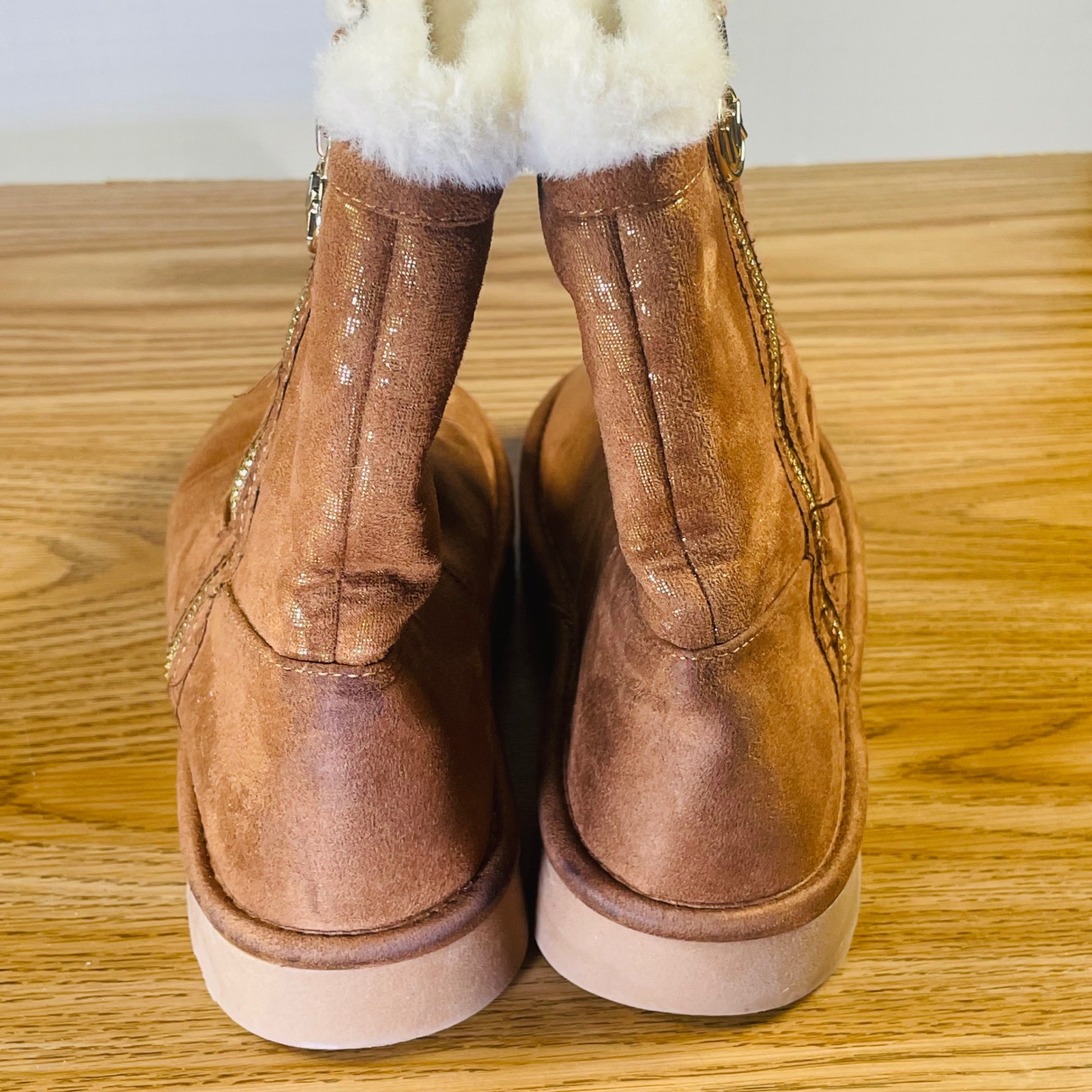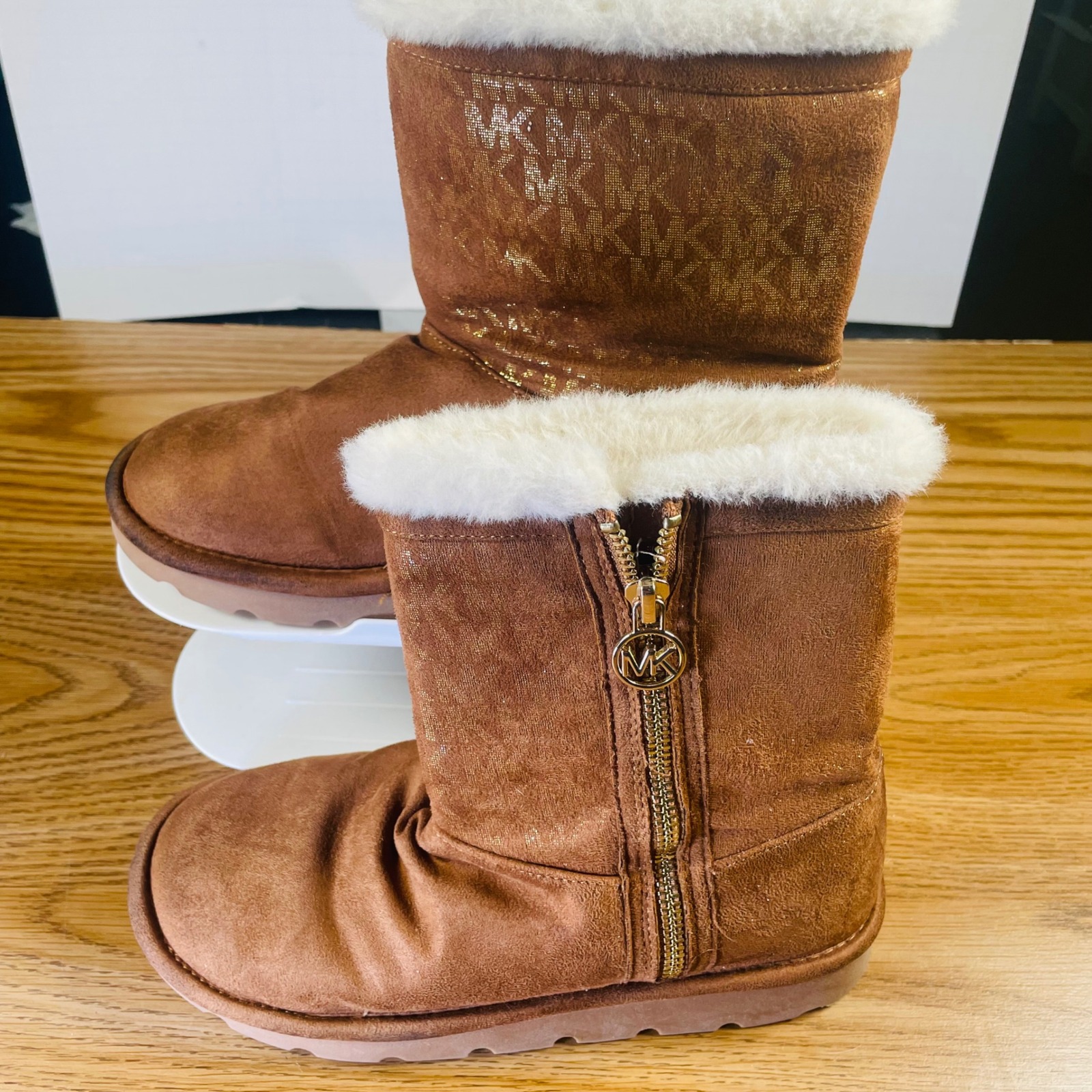 Keep their feet cozy and stylish with these Michael Kors Haedyn boots in chestnut brown. Features signature gold MK logo zipper detail, faux suede upper, and plush faux-fur lining for warmth. Durable treaded sole for everyday wear.
