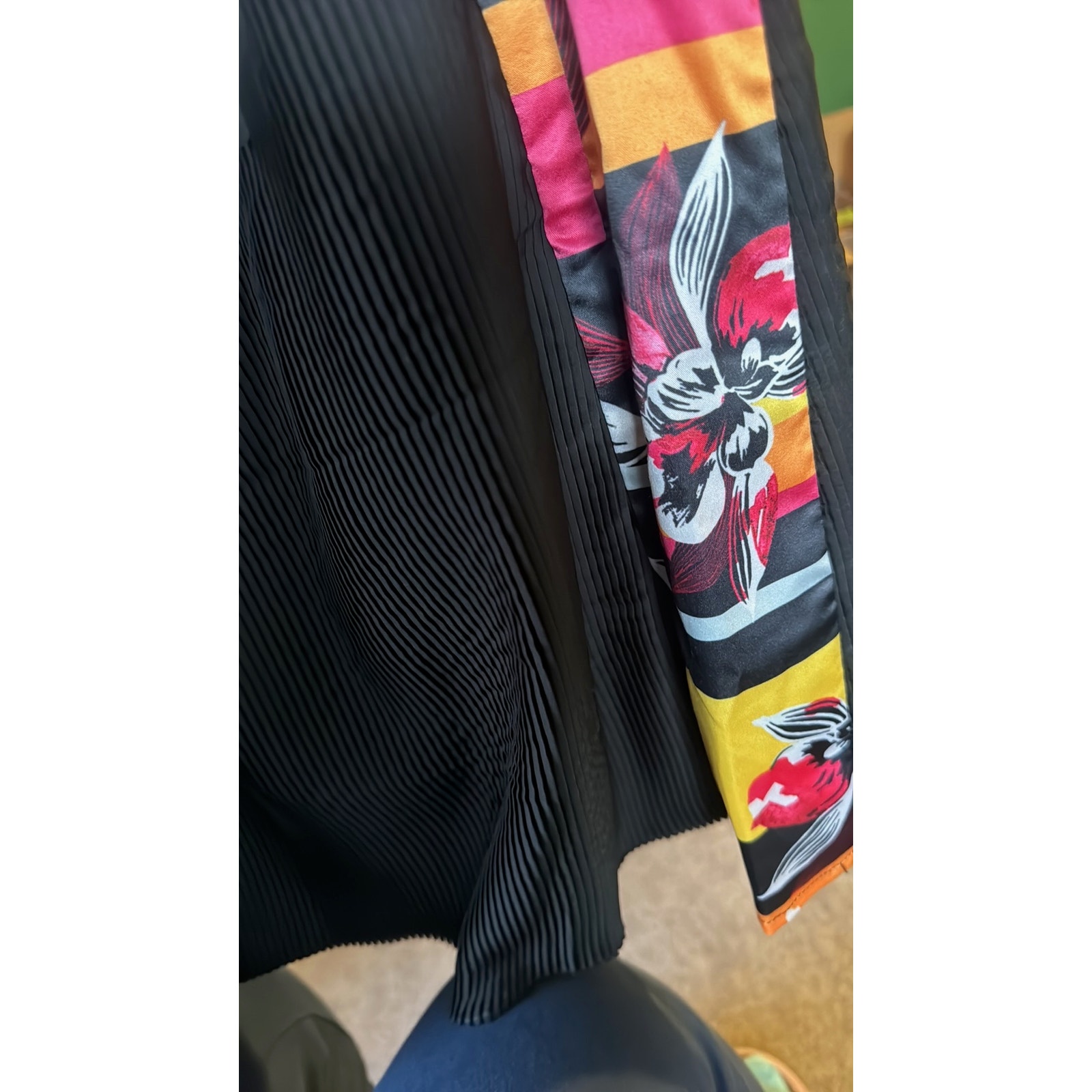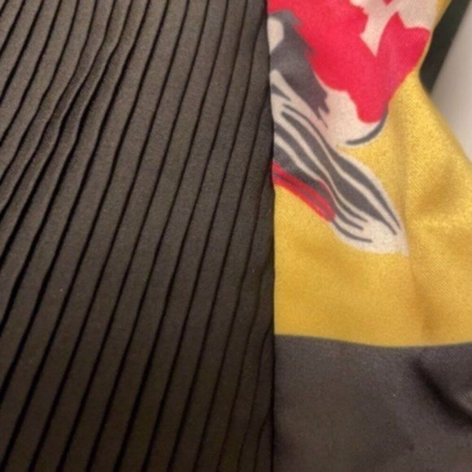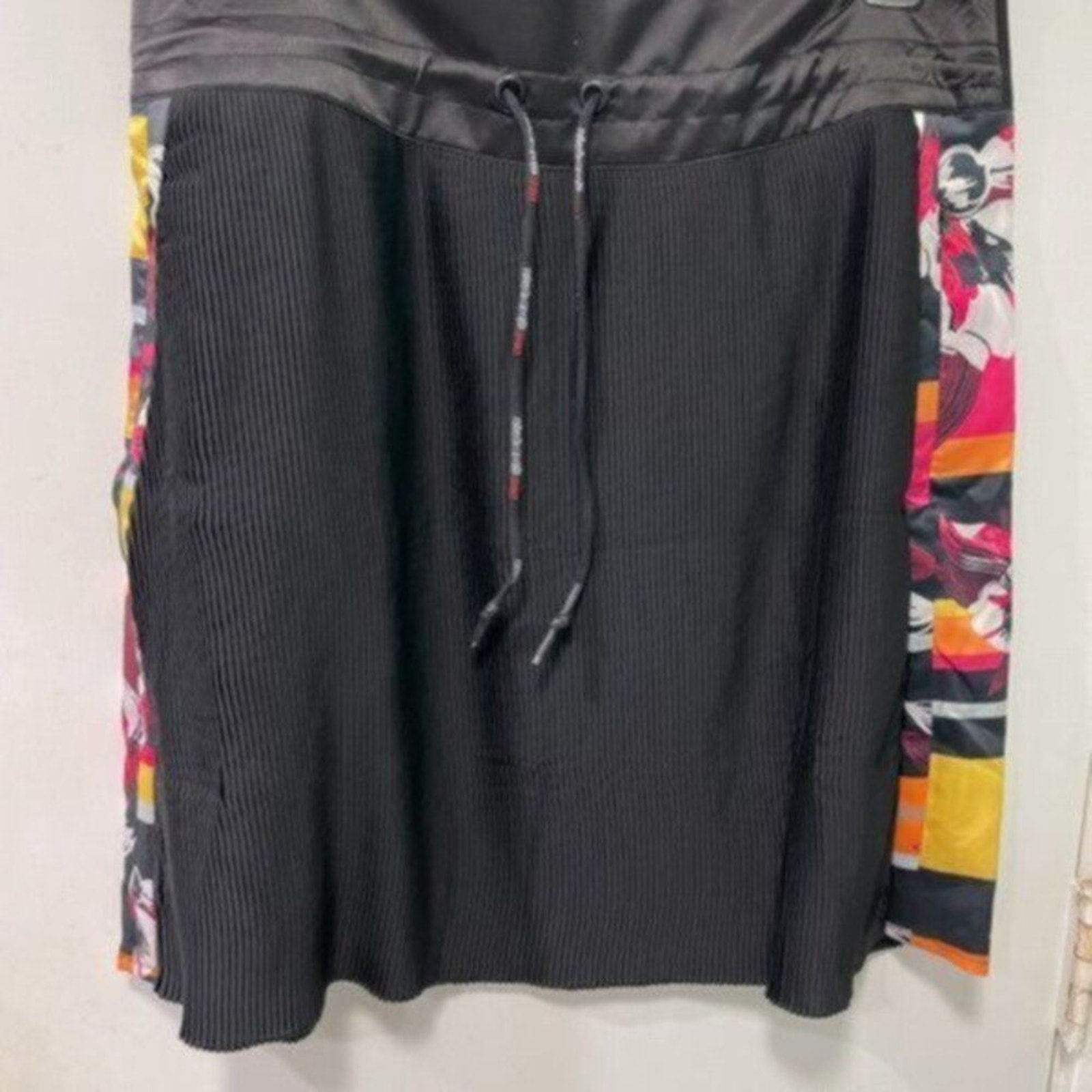 Pull-on style; high waist; logo drawstring at waistband; satin, pleated, logo, multicolor pattern, no pockets, rear closure, zipper closure, unlined length 17.16 inches Sporty gym athletic workout