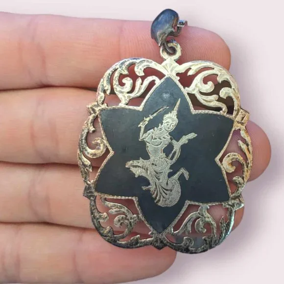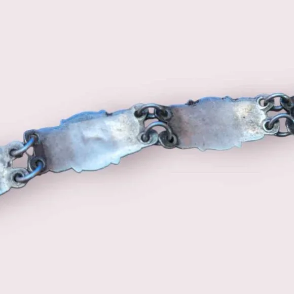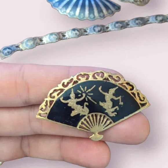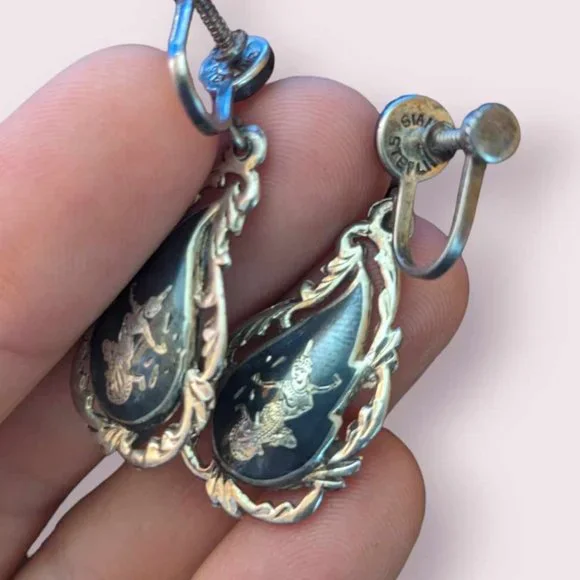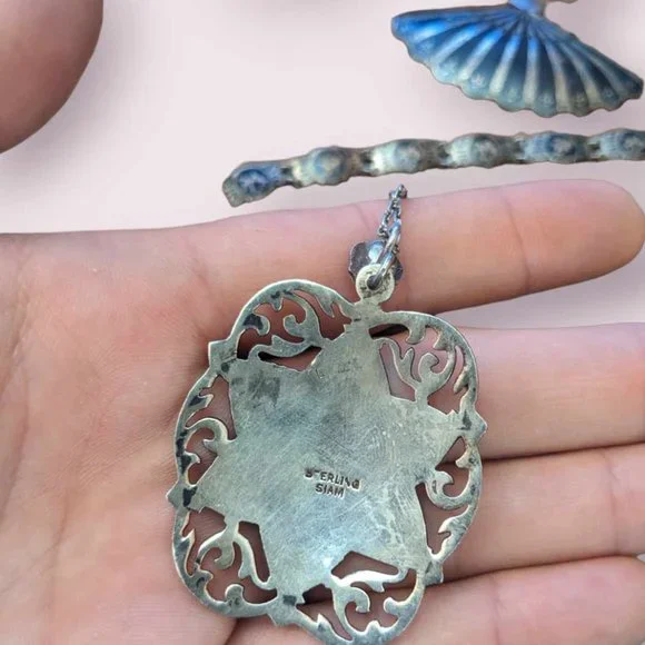 This exquisite five-piece jewelry set is a must-have for anyone who appreciates Siam vintage jewelry history. The set features beautiful pieces made from sterling silver and enamel material, with intricate designs that showcase the finest craftsmanship. Each piece is signed. The set includes a bracelet (which measures 7"), earrings, and a pendant, all in their original condition. See photos for size comparison.Siam Jewelry was manufactured from the 1930s-1980s with particular popularity throughout the 50s and 60s. Although Siam officially changed its name to Thailand in the 1940's, the "Siam" nickname for this style of jewelry stuck. Very collectible sought after pieces.