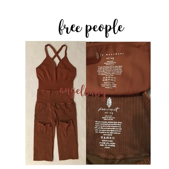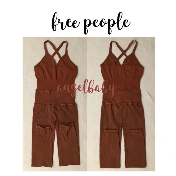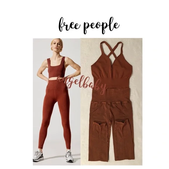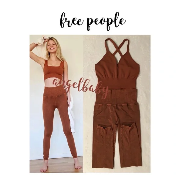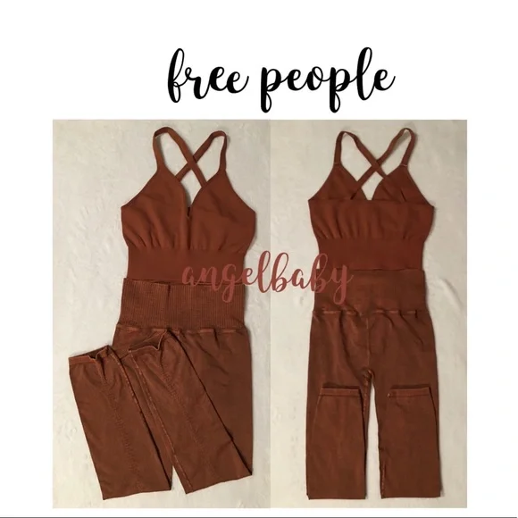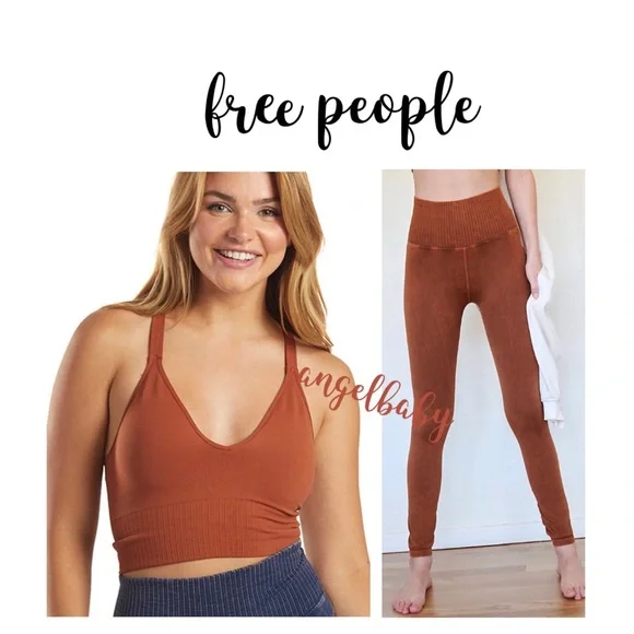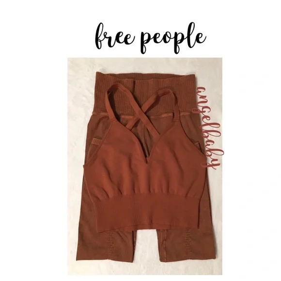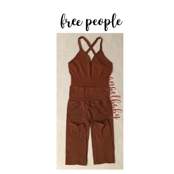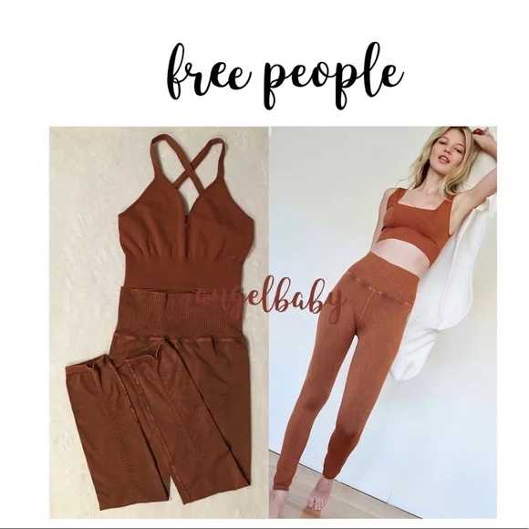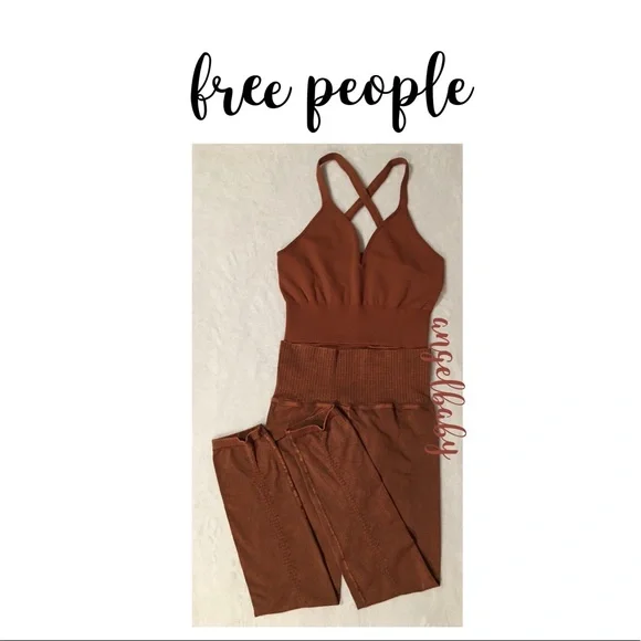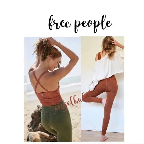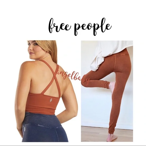 Free People Good Karma Shanti Leggings and Good Karma Crop Top.With a holds you in high rise super soft feel, these ultra flattering transition from brunch, bikram, and beyond. They have breathable pinhole detail for everyday wear and a no fuss fit. Perfect for keeping you comfortable while you move. Good Karma Crop Top an ultra flattering active crop with a plunging neckline and ribbed details to enhance the shape of your body. It has crisscross straps, entry level compression, longline silhouette, and it’s equipped with SPF 30 UV protection. Color is Toasted Cocunt and Argon Oil Size M/L 🔴No Logos🔴 fit sizes 6-10. Never worn! It doesn’t match perfectly but it looks great together!