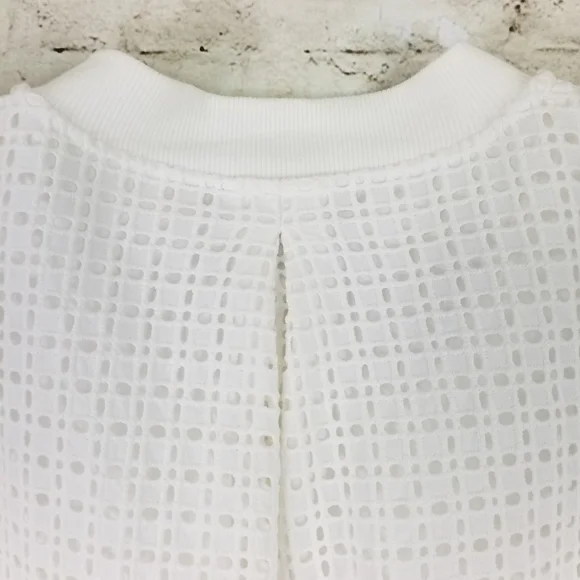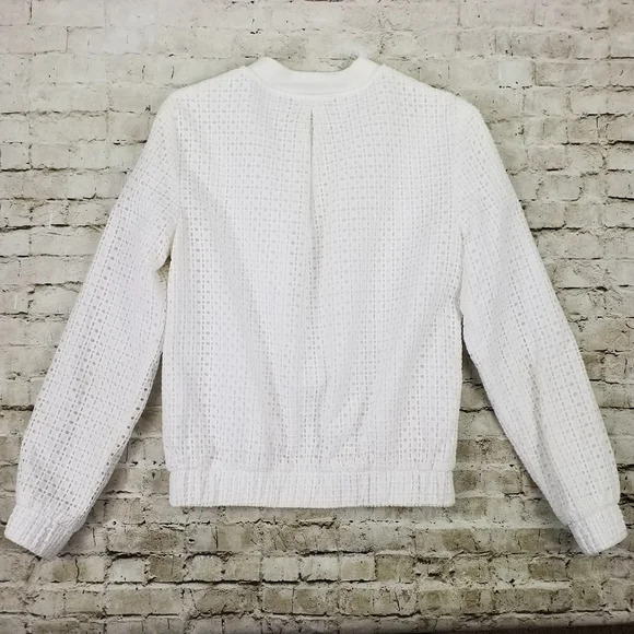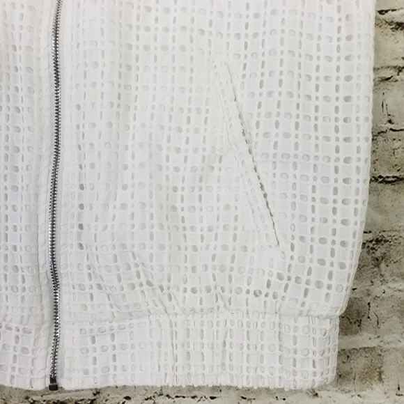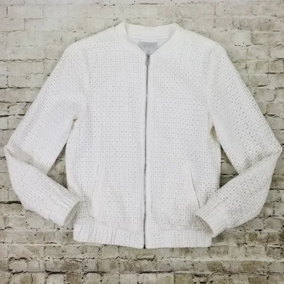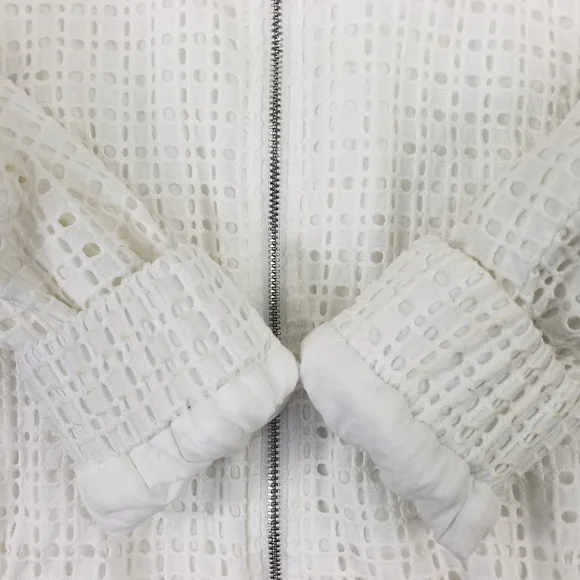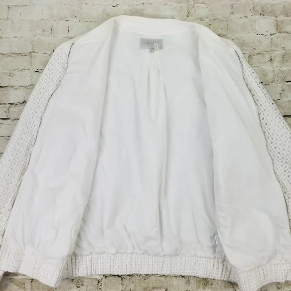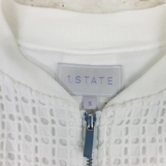 1. STATE Cloud White lace Overlay Long Sleeve Bomber Jacket Womens Size SmallPlease review photos and detailed measurements carefully to ensure a good fit. Colors may vary depending on your specific viewing device.Shell & Lining 100% CottonLinedDry cleanRib banded neckFull front zip closure; silver toneFront diagonal entry hand pockets (still sewn shut)Long elasticized sleevesInverted pleat at center backElasticized hemApproximate Measurements Laying Flat:Shoulders 15" acrossBust 18.5" acrossSleeve length 23.5"Length from back collar bottom to hem 21.5"Very gently worn, preowned, condition showing interior cuff discoloration as shown. G9