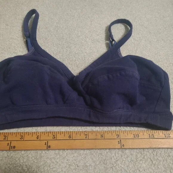 Made in the USA with Organic Cotton. This style is the Pixy Bra, designed for A-D cups. Note this is not a sports bra but offers very comfortable light support. This is a high quality brand.1 Navy blue, 1 pale pinkFrom the brand site: Horizontal seams across the cups, fabric front straps and other thoughtful details shape and support—without sacrificing style or comfort. Designed with measurements from real women, not mannequins. Supports A-D cups. Slip-on style, no back closure.Adjustable straps with rose gold hardware. Double-layered, organic cotton with a covered elastic band.94% organic cotton, 6% spandex.Cut and sewn in the U.S.Machine wash and dry.