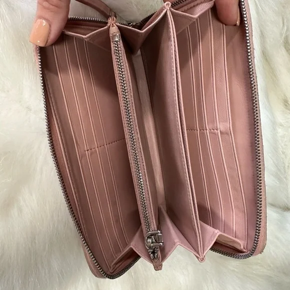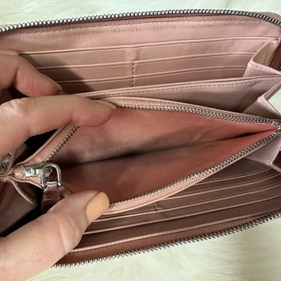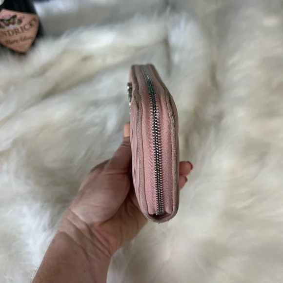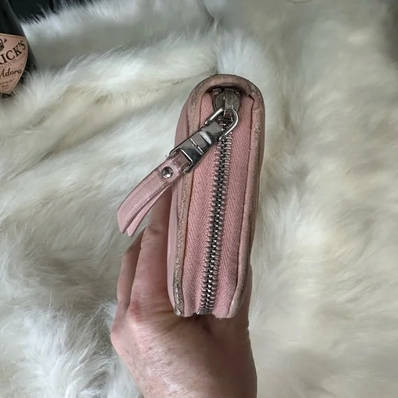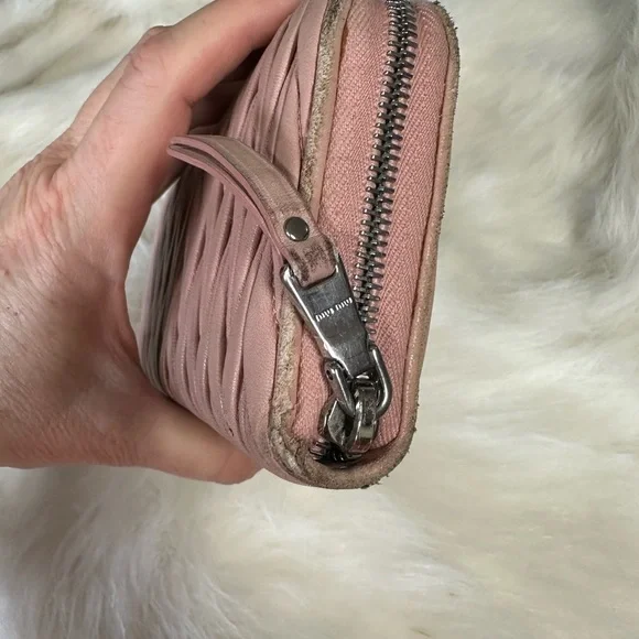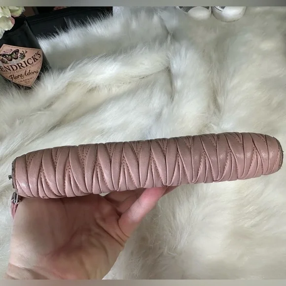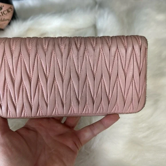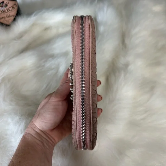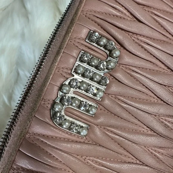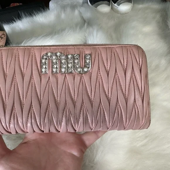 Genuine leather zippy zip long wallet in good condition by MIU MIU!Front logo Bedazzled in pearl and rhinestones. Size:7.9”x4.1”.Has 2 slip or full size bill compartments with a center slip pocket, 12 credit card slots, and a zip closure coin compartment.All zippers work perfectly!No rips or tears, just minor rubs and wear from use.See all photos! Code: 197A