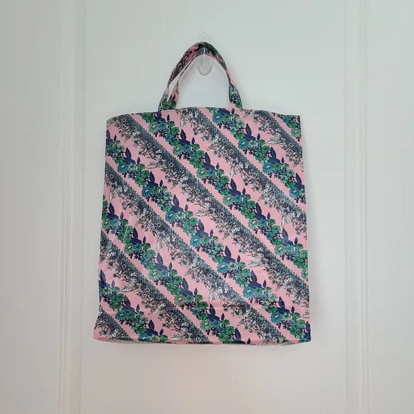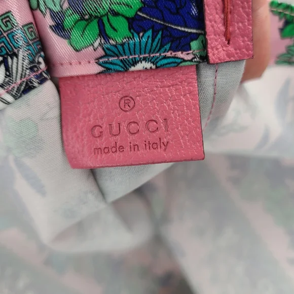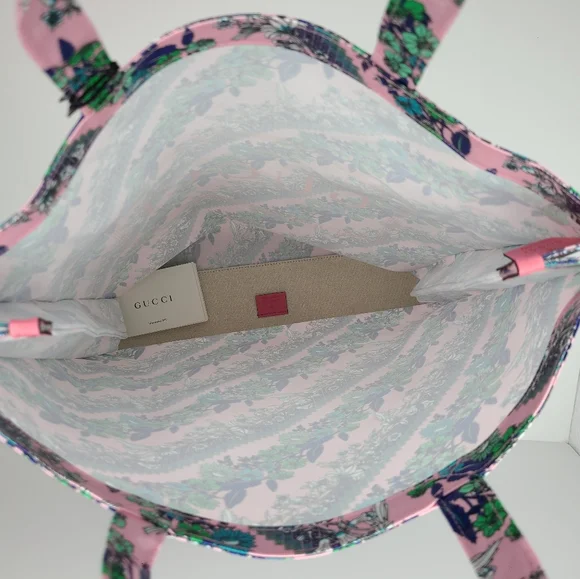 Authentic Gucci Montecarlo Pink Floral Shopper Tote. Shop in style! Soft Plastic Printed Coated Cotton with floral pattern. Double Handles. Open top. Removable bottom support with leather Gucci tag. BRAND NEW! Easy to fold and store when not in use. 14.75" L x 4.25" W x 16.5" H *All packaging and shipping is video recorded for security purposes*