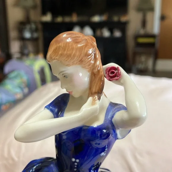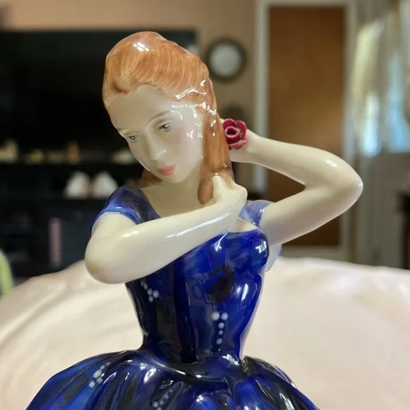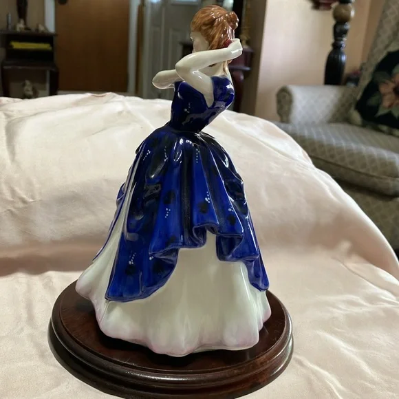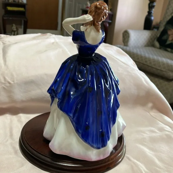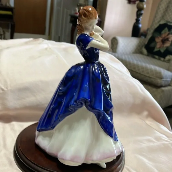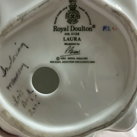 This is Royal Dalton bone. China made in England number HN3136. Her name is Laura she was designed by Pauline Parsons in 1982 and manufactured in England in 1988 she is 8 1/2” x 5” x 4 1/4” perfect flawless condition China. No chips no cracks no marks always kept in a China cabinet, beautiful elegant addition to anyone’s collection. wood display base did not come with her, but she looks beautiful on it and I would be willing to include it to a buyer at no additional charge.