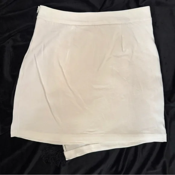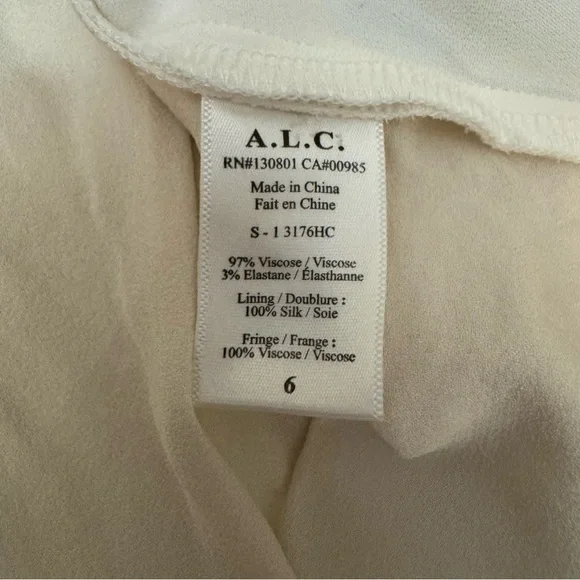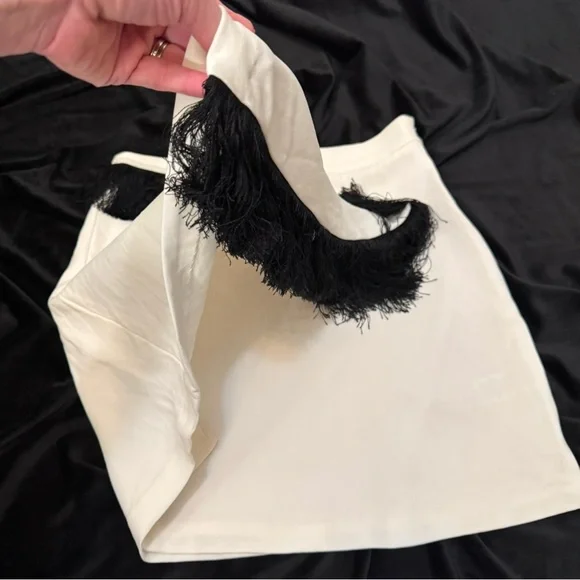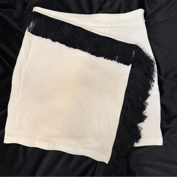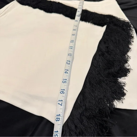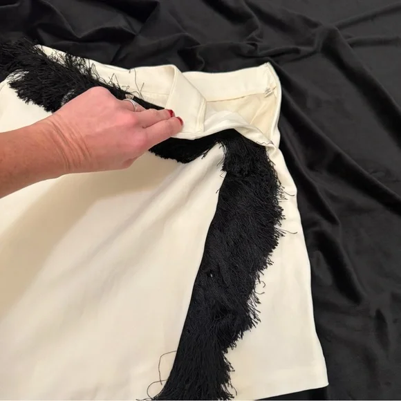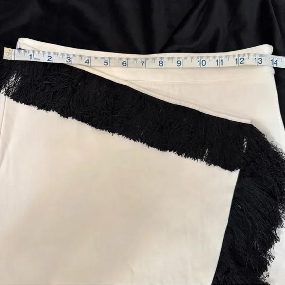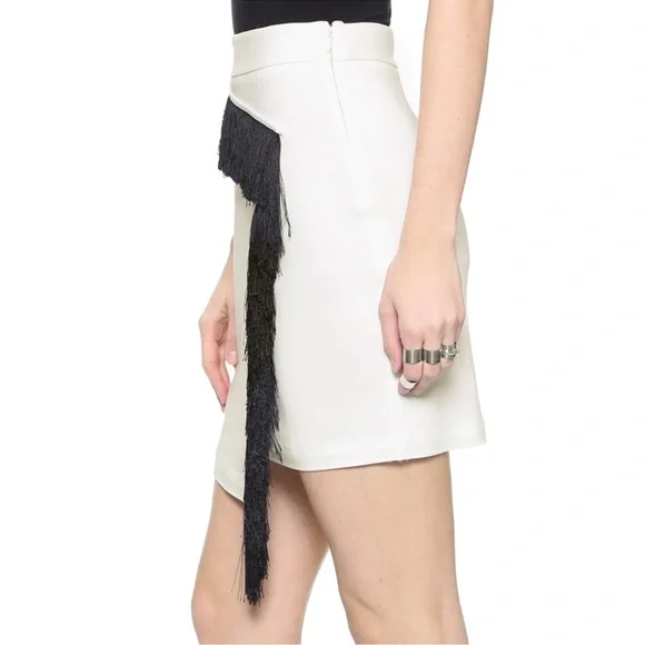 Crafted with a hint of stretch, the classic mini gets a modern update with the faux wrap design in fanciful fringe.Designer: A.L.C.Style Name: LorenColor: Cream & BlackSize: 6• Waist 14"• Length 18.5" at the longest pointFeatures:• Asymmetrical• Fringe Trim Detail on Front• Concealed Side Zipper with Hook & Eye Closure• Lined• Faux Wrap Style• Back Waist DartsSelf: 97% viscose, 3% elastaneLining: 100% silkFringe: 100% viscoseCondition: New With Tags!(two minor imperfections shown in photos)ALC A