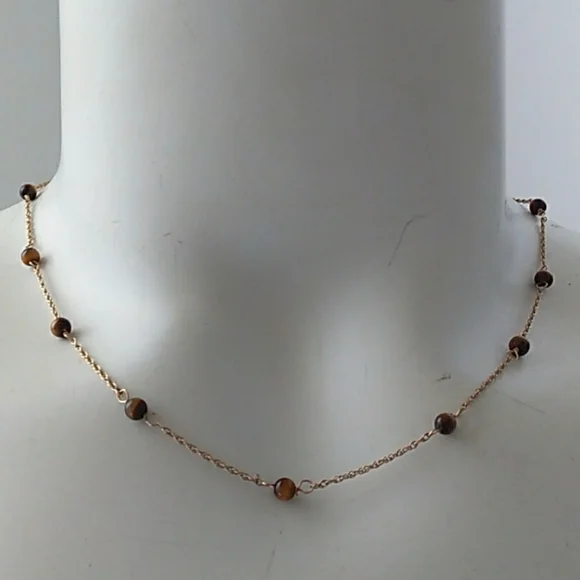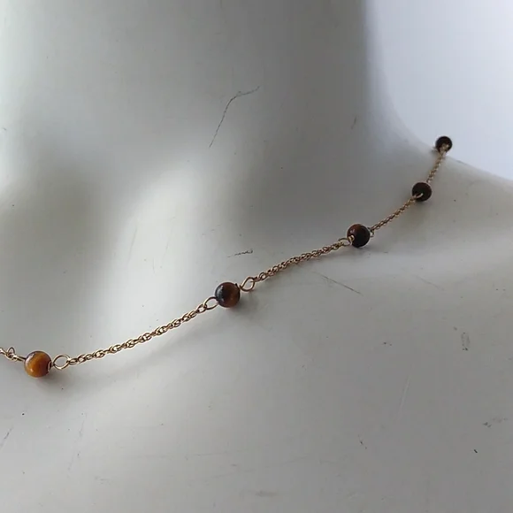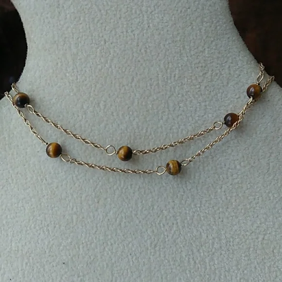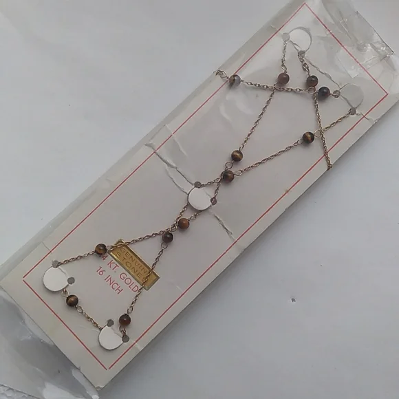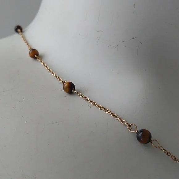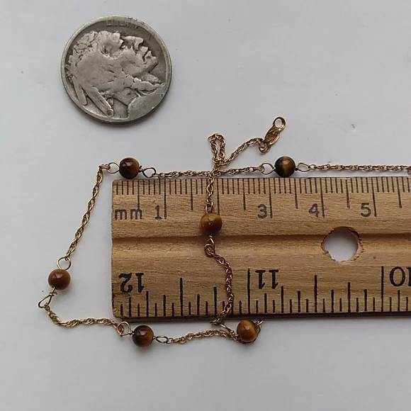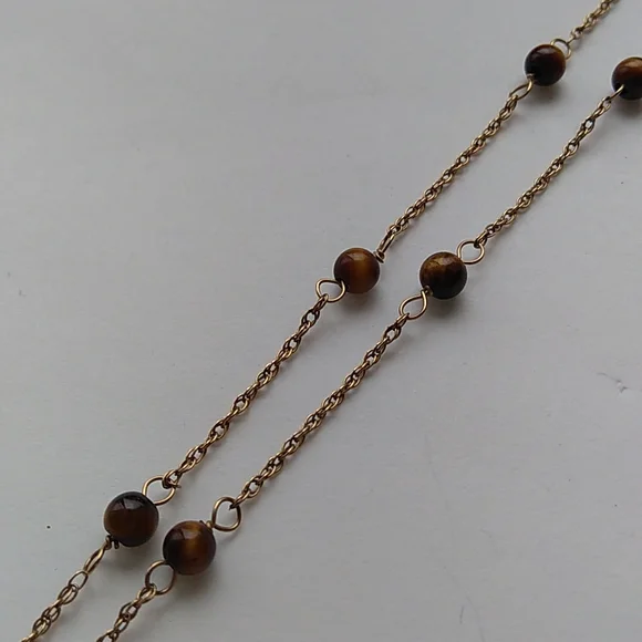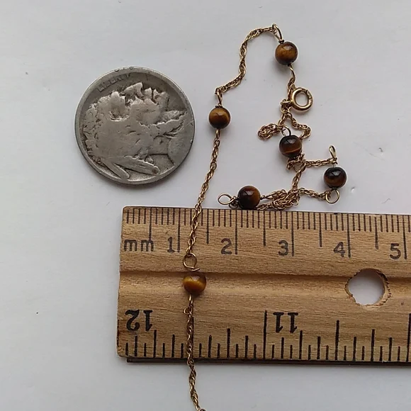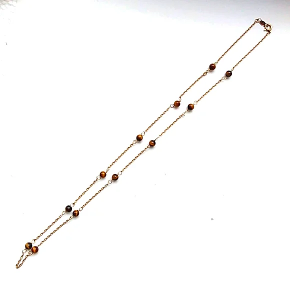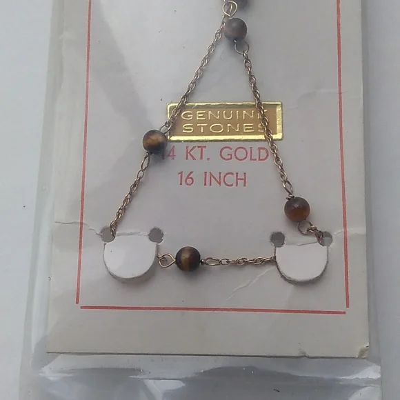 Beautiful c1960s - '70s (possibly older, I'm not sure) NOS Dead stock NWT VintageSolid 14K Yellow Gold 3-4mm Genuine Tiger's Eye Station Necklace. *Stamped, Tested & Guaranteed!* Light age related patina- mainly on clasp, Overall Excellent NEW Vtg Condition! The cardstock does show wear, due to age/handling. I have 2 of these available although the 2nd isn't on a card but will ship in a velvet gift box.Lmk which you prefer, at time of purchase.(Other Listing Styles) Statement pendant lariat choker torsade torque cable link curb cuban box chunky Figaro snake rope twisted princess pin safety catch bracelet jeweled micro mini huggie hoops drop dangle tassel fringe ball bubble bead button bon bauble costume rhinestone paste stone gem cocktail rose fruit party wedding bridal band solitaire trinity celestial zodiac birthstone monogram initial boho butterfly dragonfly bee bug figural pave chic accent coin Dainty delicate rose pastel neon mint Freshwater Baroque Rice Tahitian saltwater Cultured tcw twc diamond Amber topaz Tourmaline turquoise crystal Vauxhall cabochon filigree gold Artisan crafts acrylic enamel Resin Bakelite lucite celluloid gemstone feather handmade natural Earth Mined 925 y2k 14k 18k platinum sterling silver gold engagement ring '90s '80s '70s '60s '50s '40s '30s '20s flapper Edwardian Victorian art Deco nouveau Industrial Hattie Carnegie Juliana Miriam Haskell Czech Glass Sommerso Venetian Murano hand poured blown molded pressed moto leather
