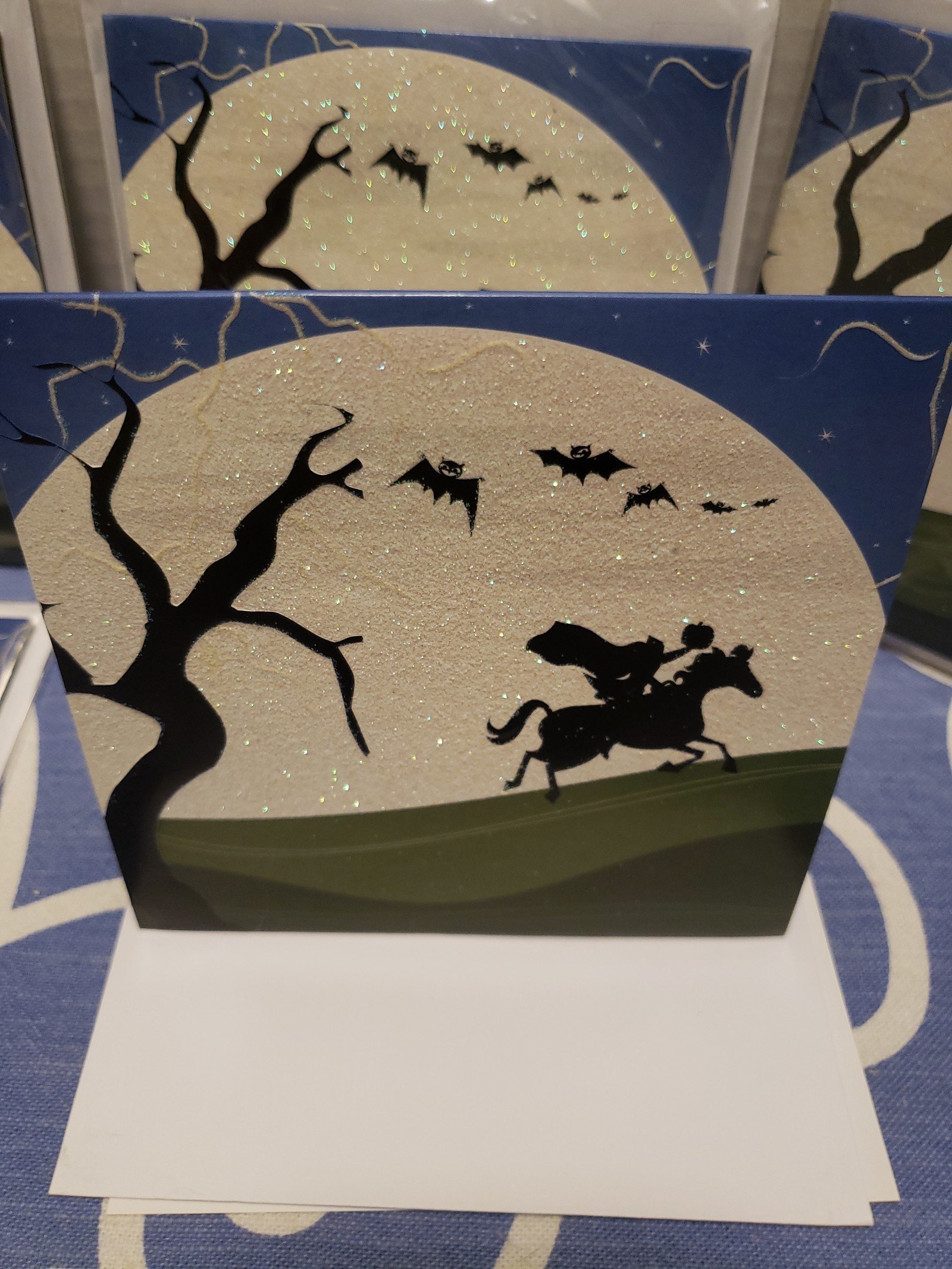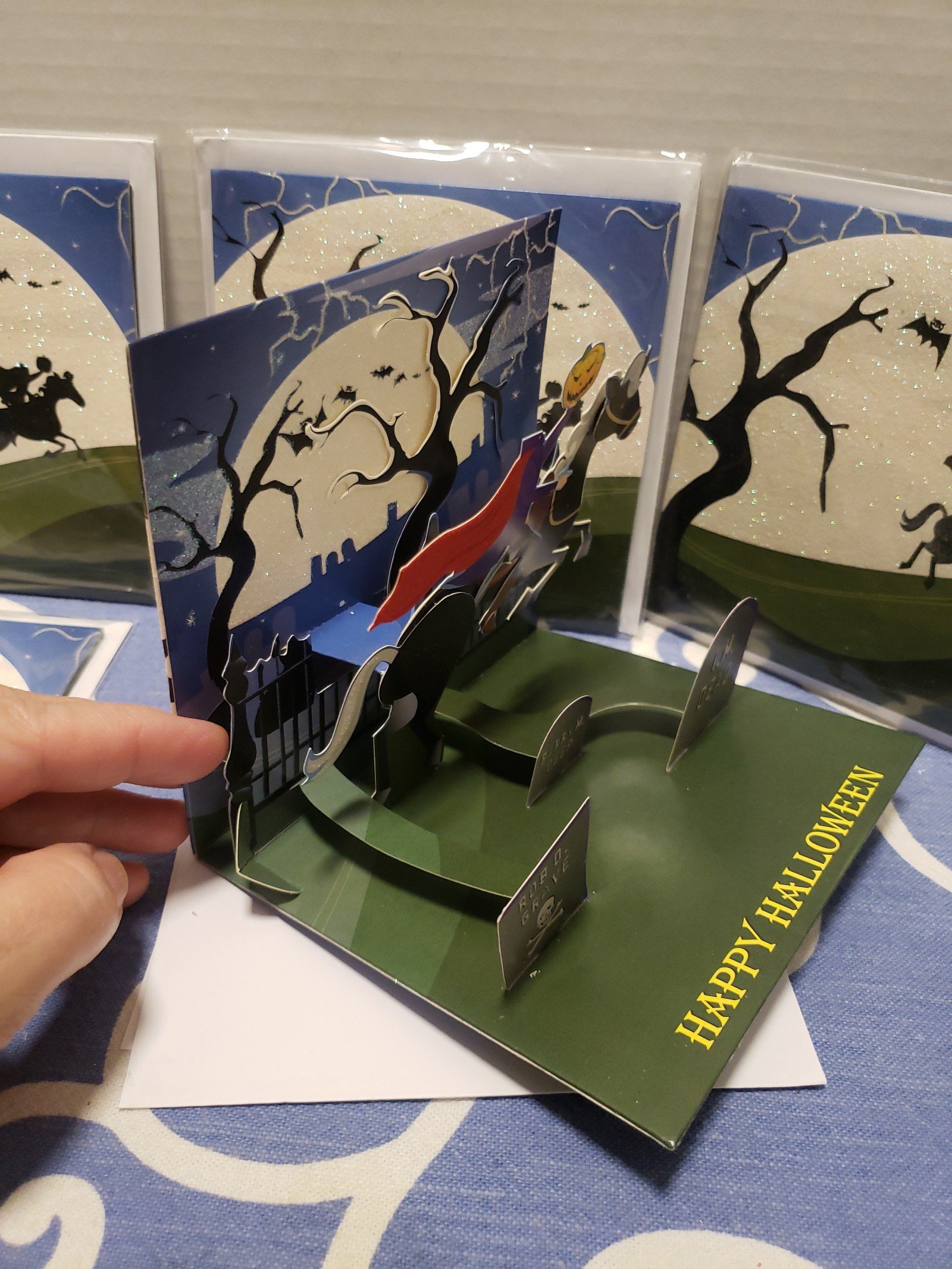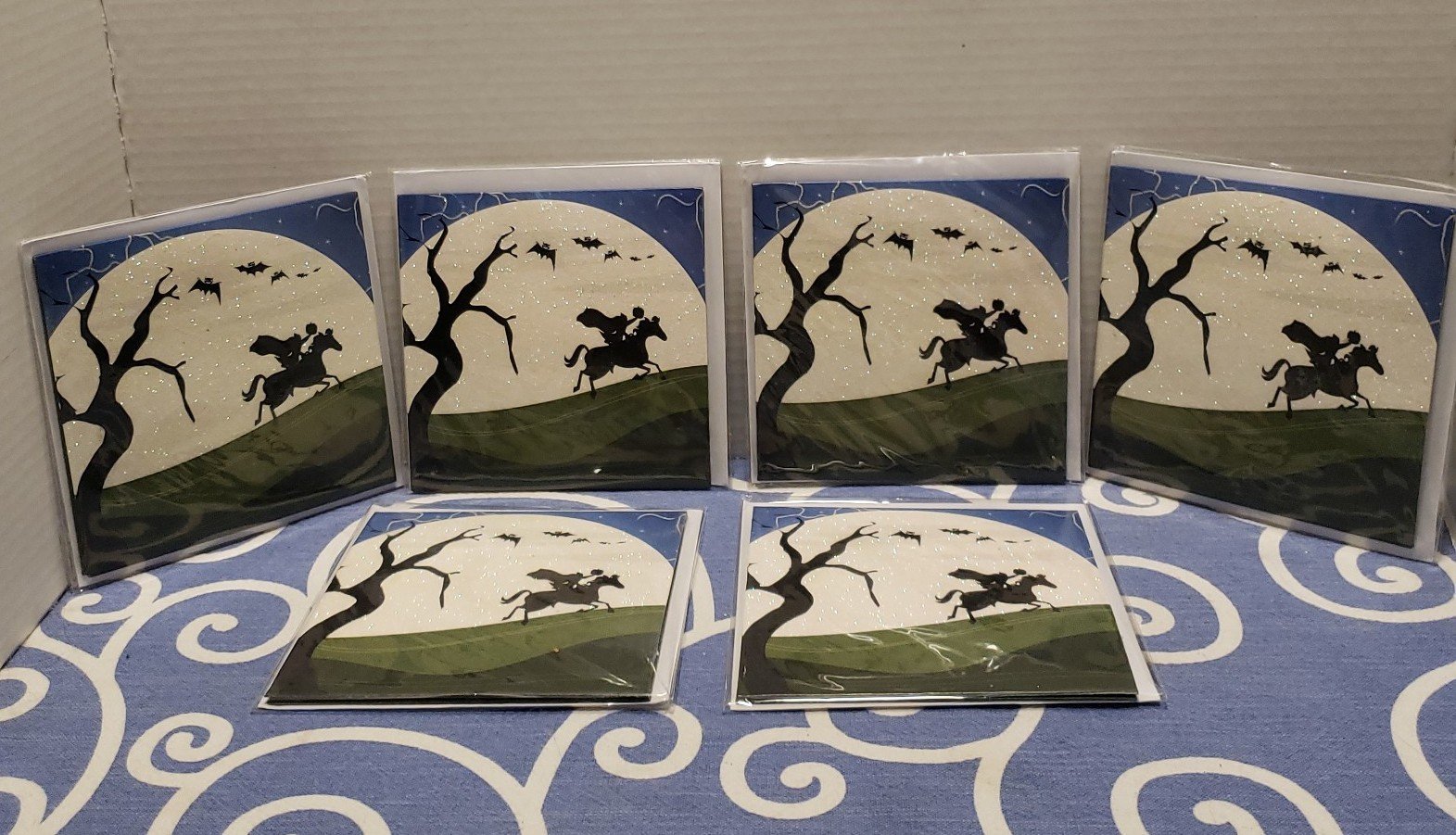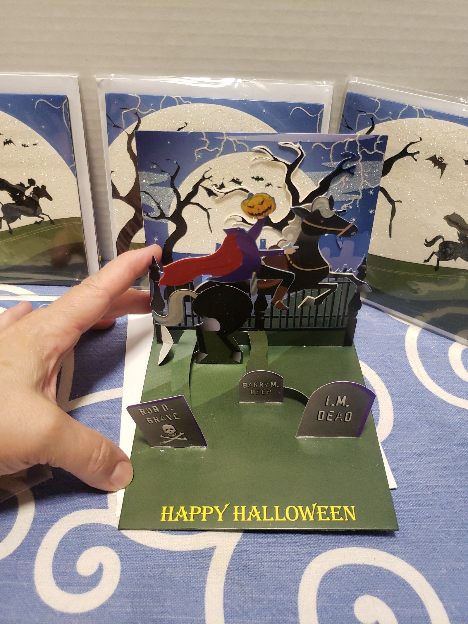 Halloween Headless Horseman pop up greeting cards set of 6. Made by Treasures. Front has a sparkly moon with black horse and horseman. Bats in the sky and a creepy black tree. Pictures shown of all. Cool pop up inside. Write your message on the back. Six cards with six envelopes.