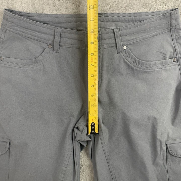 The Kuhl Women's 10 Gray Cargo Pants are designed for outdoor activities like hiking and offer a comfortable and stretchy fit. Made of lightweight polyester material, these pants feature a solid gray color with accents and a convenient roll-up design.