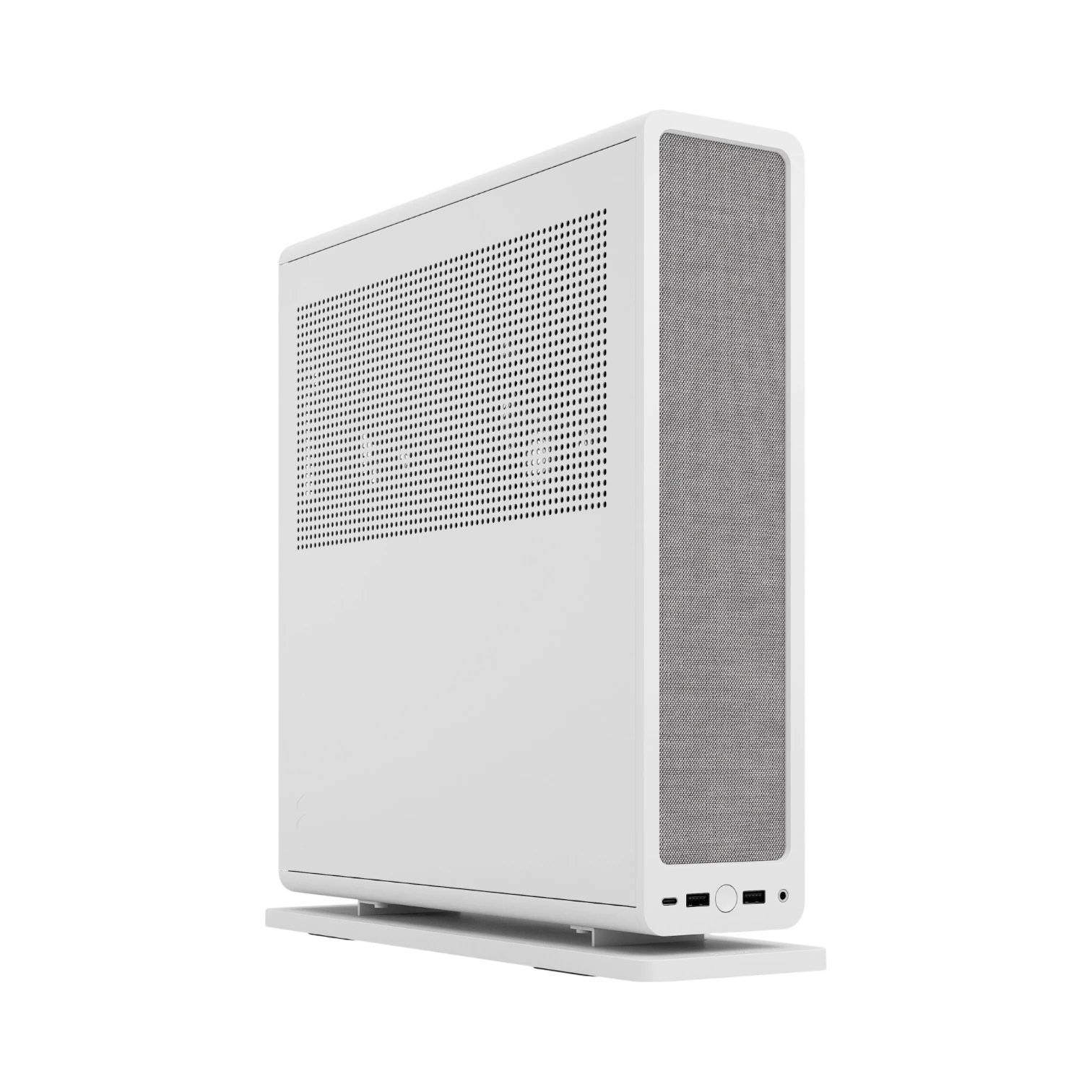 On the outside, a white front panel finished with fabric and CNC-machined aluminum creates a clean look that fits gaming setups, home offices, and entertainment centers. You can stand the case vertically to save desk space or lay it horizontally so it slides neatly into a TV cabinet.