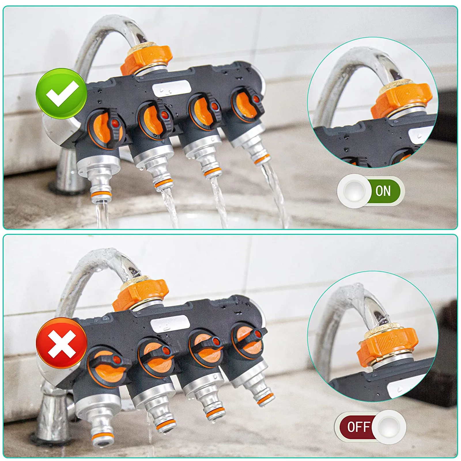 Determine the water flow yourself The water flow is adjustable and lockable on both sides according to your needs. Connect 4 devices to the tap. Water distributor suitable for 3/4 inch and 1/2 inch tap and garden hose.