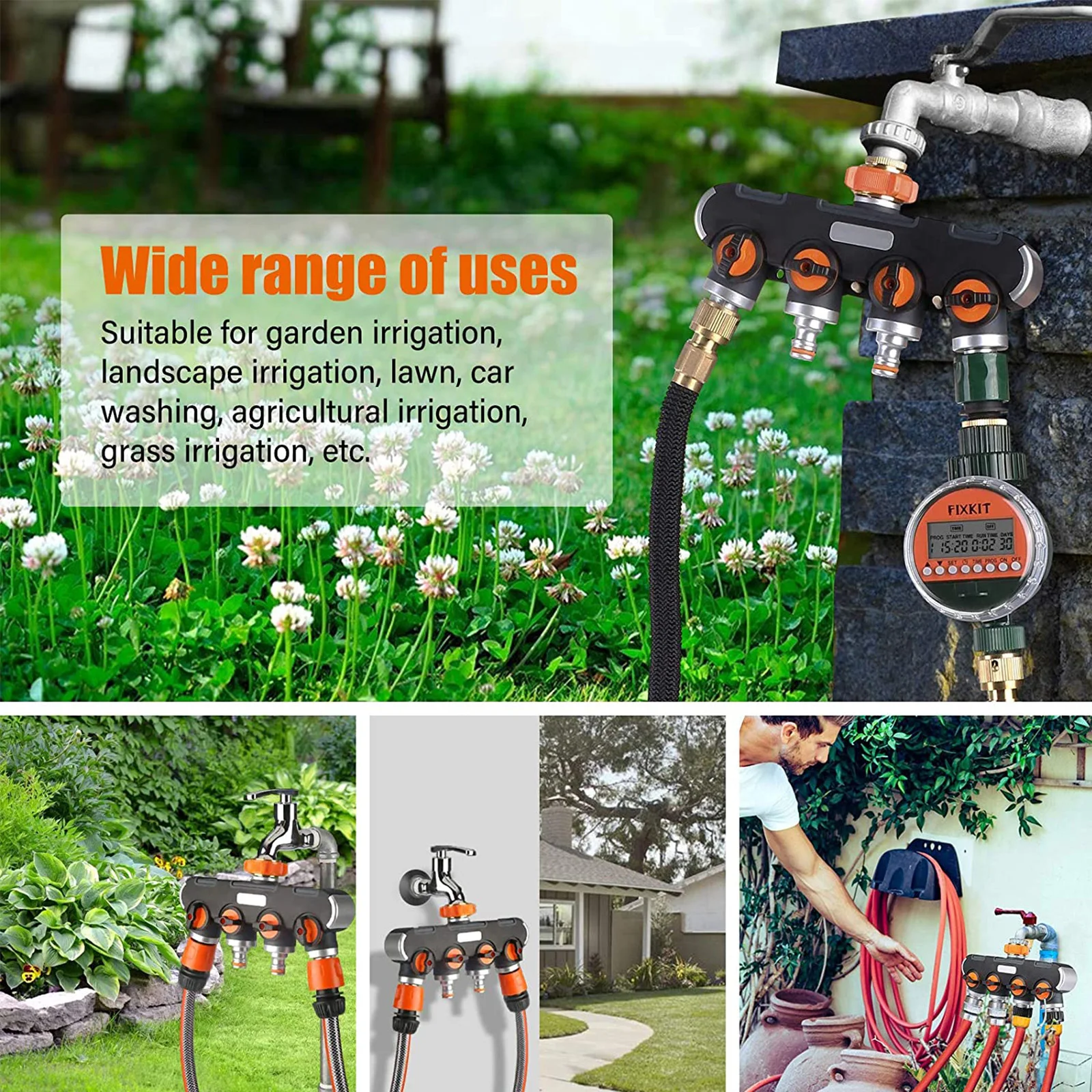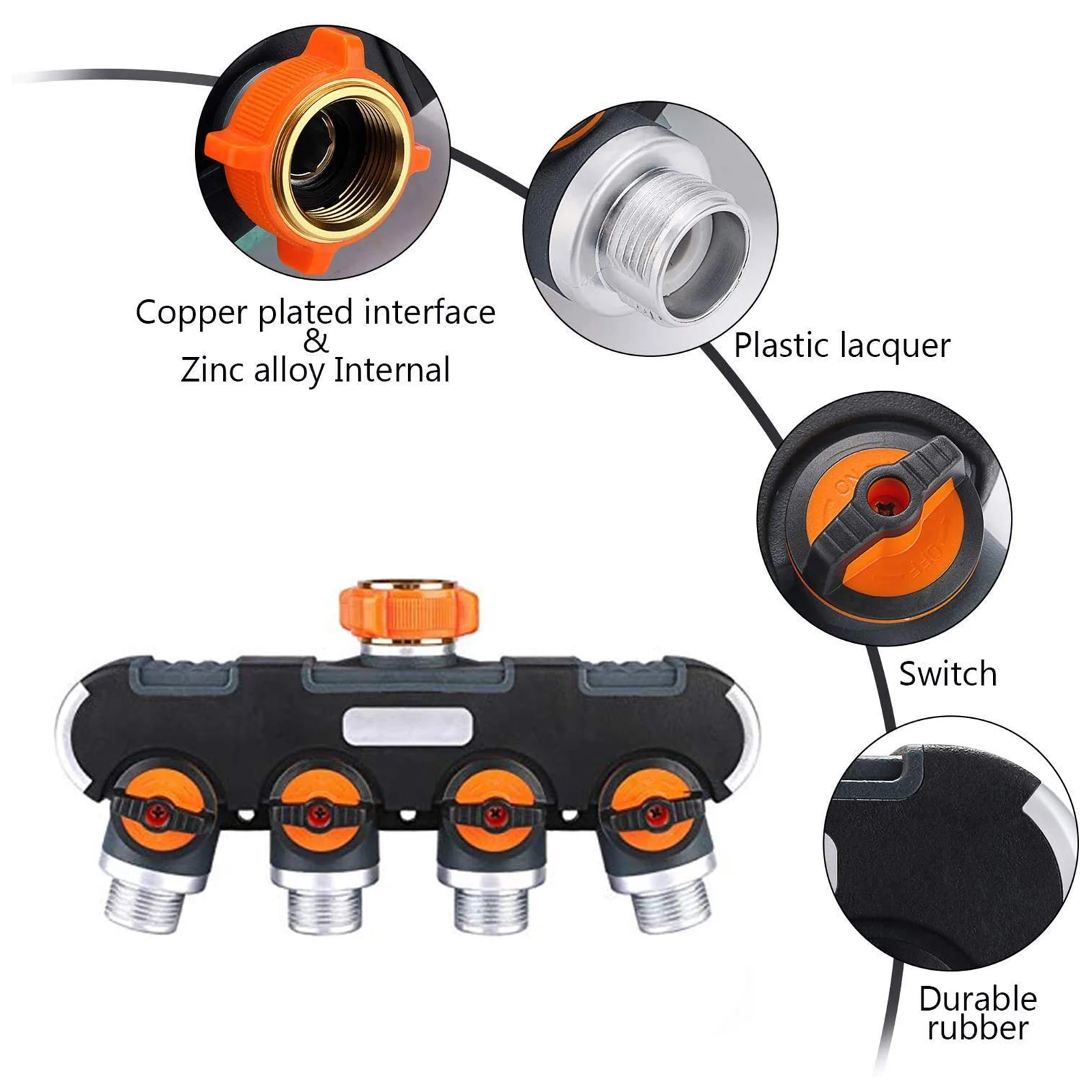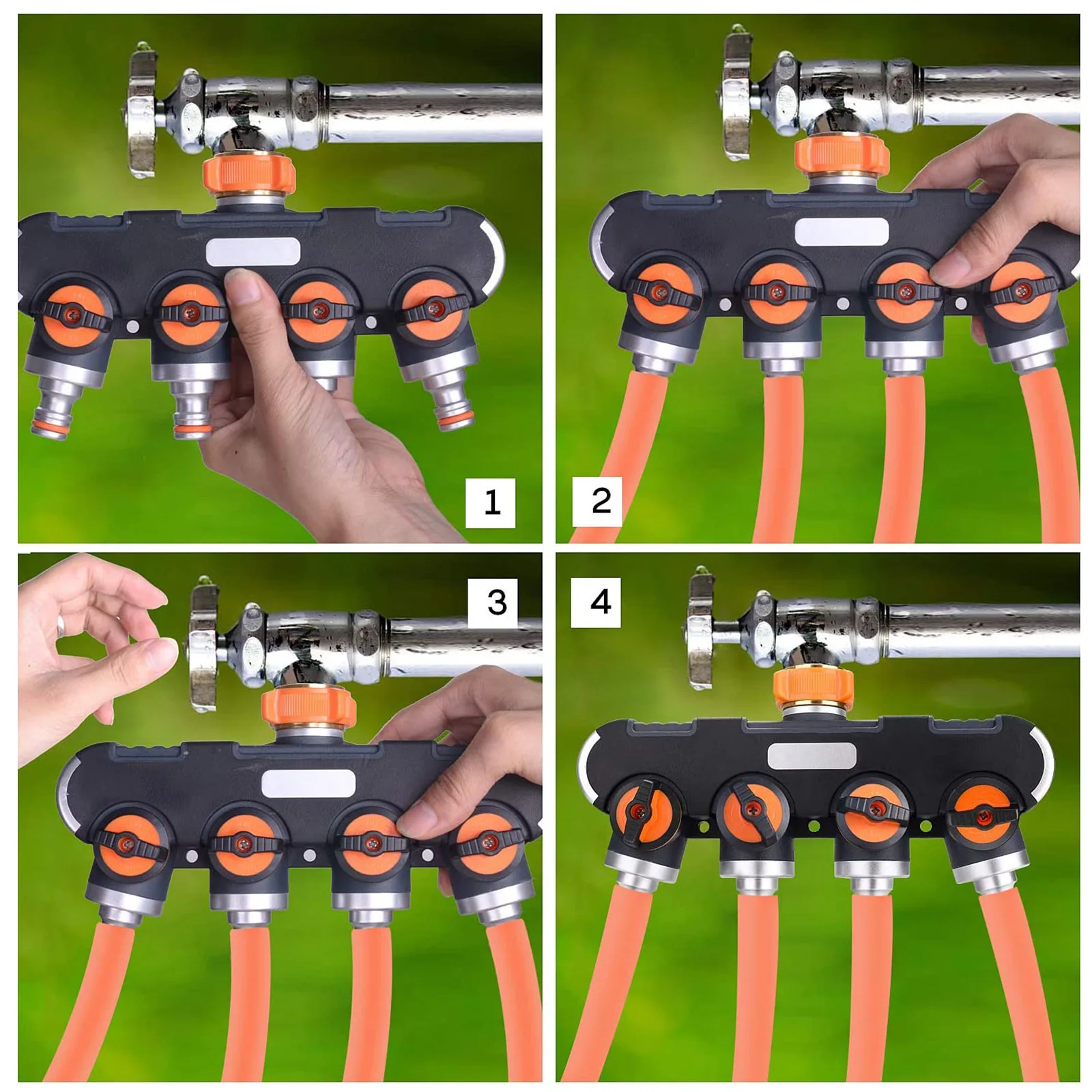 4-way splitter: convert a garden tap into 4 outlets, very convenient for controlling multitasking irrigation, garden irrigation, washing pets, cars, and machines. You can use either one output individually or multiple outputs. It is a great solution for garden watering.