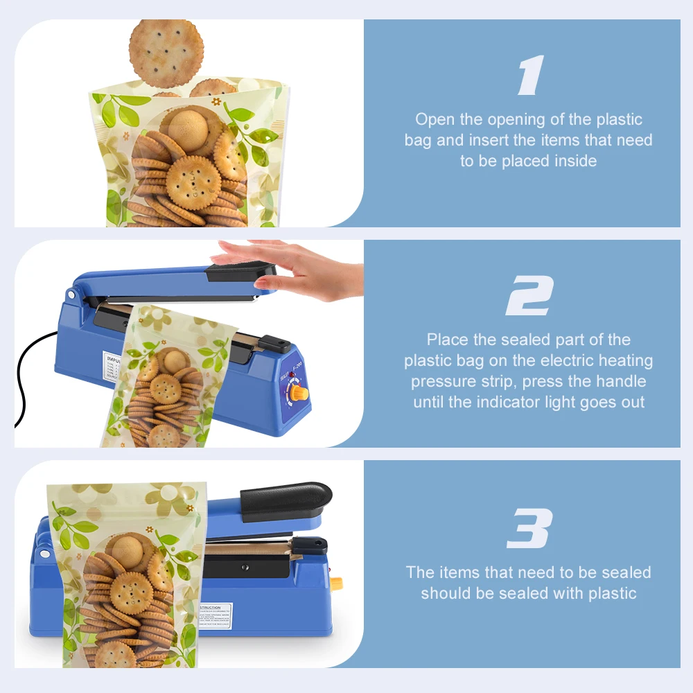 1.The impulse sealer machine are available in 8 temperature modes, ideal for a variety of materials packing, 1-2 level for plastic bags, 3-4 level for non-woven bags, 5-6 level for kraft bags, 7-8 level for aluminum foil bags.