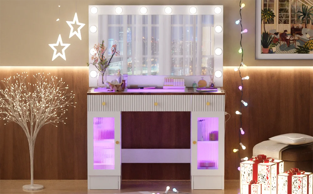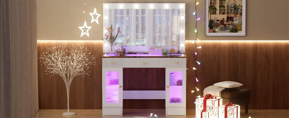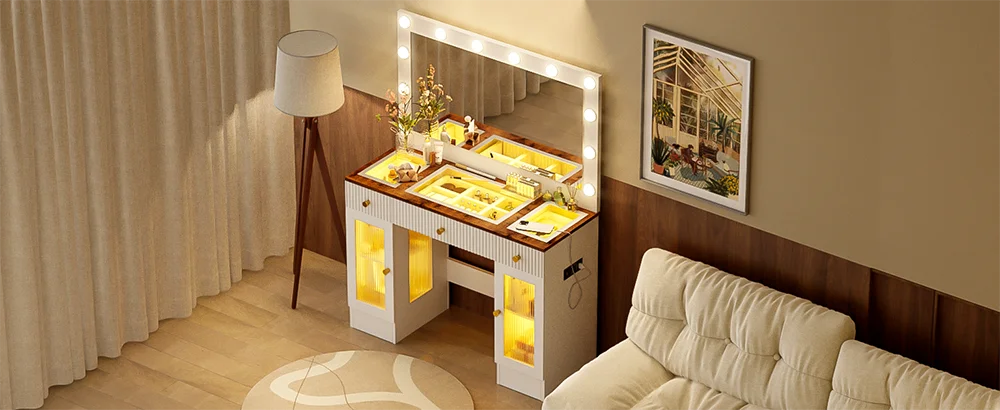 Glass Cabinet with RGB Ambient Light: This sleek dressing table features two glass cabinets with height-adjustable shelves and RGB ambient lighting, adding a modern touch to your room. Control the lighting with a simple switch and choose from multiple light modes to create the perfect atmosphere.