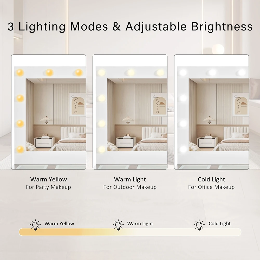 3 Lighting Modes & Adjustable Brightness: The dressing table is equipped with a large mirror. There are 12 Hollywood bulbs around the mirror, providing 3 color modes (warm/natural/cool) and adjustable brightness. The dressing table with mirror and light can meet all your different needs, perfect for home makeup, salon and live broadcasting.