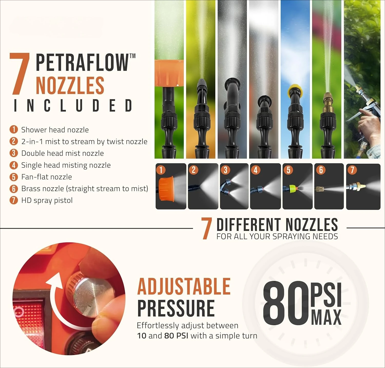 Reach further with the included 100 foot hose: Get the longest backpack sprayer hose on the market to easily cover large areas without moving your sprayer! Includes an additional 4 foot hose ideal for use as a backpack sprayer. Includes 5 swappable nozzles for all your jobs, from lawn care, to misting delicate plants.