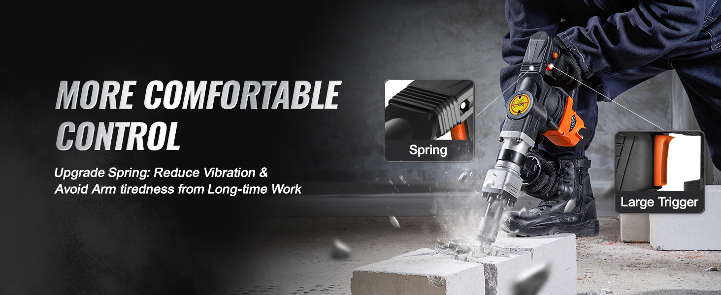 Shock Absorbing Handle: Equipped with an upgraded shock absorption structure that includes additional springs, this demolition hammer reduces effort and fatigue. A larger trigger switch enhances control comfort while the robust spring design prevents breakage, ensuring safety and preventing hand injuries.