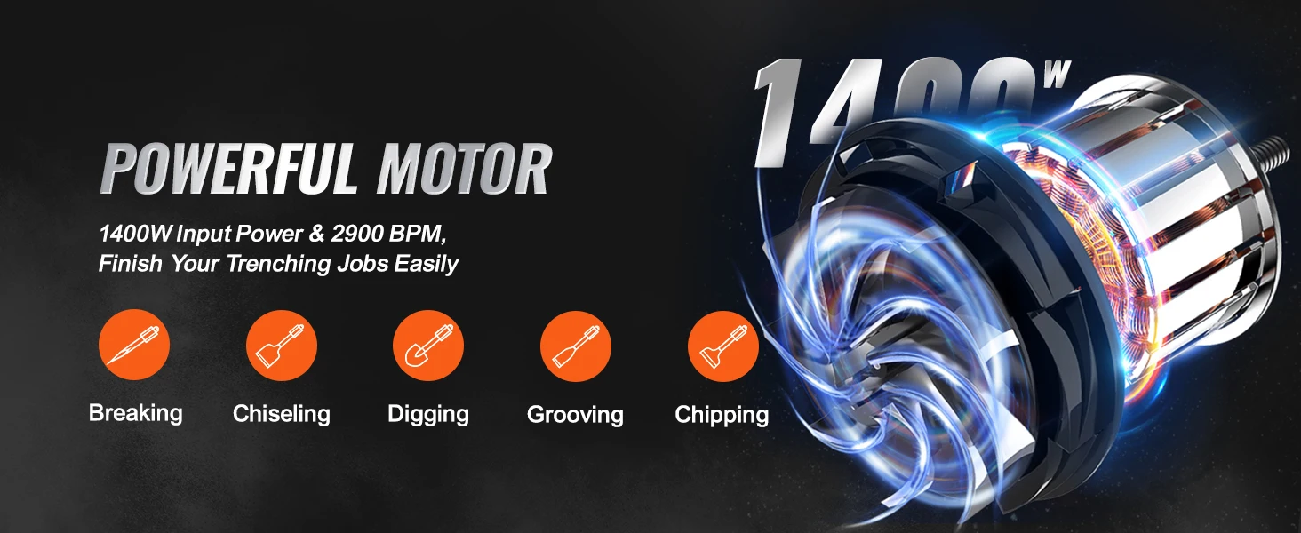 Efficient Cooling System: Designed to withstand intense work, the efficient cooling system keeps the motor cool, enhancing the lifespan of the concrete breaker. It ensures the motor remains at low temperatures even during extended use.