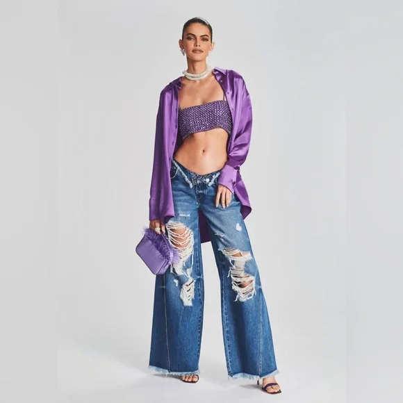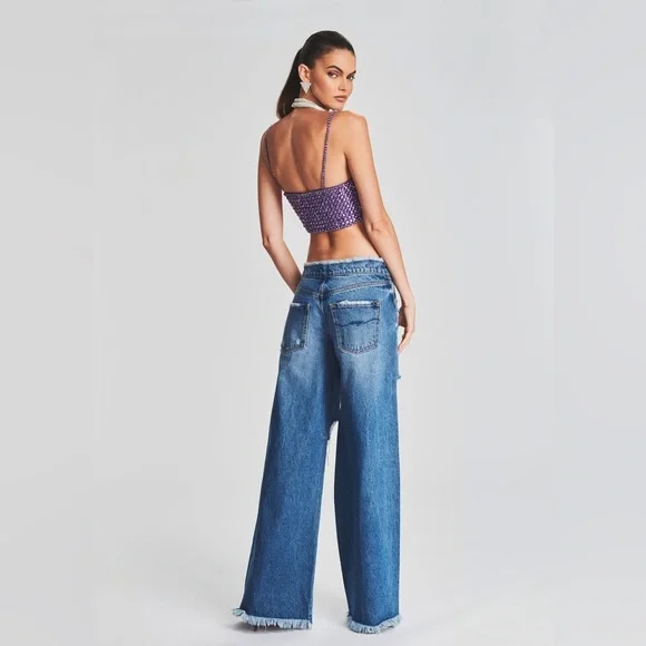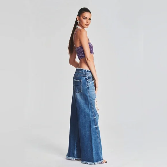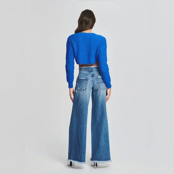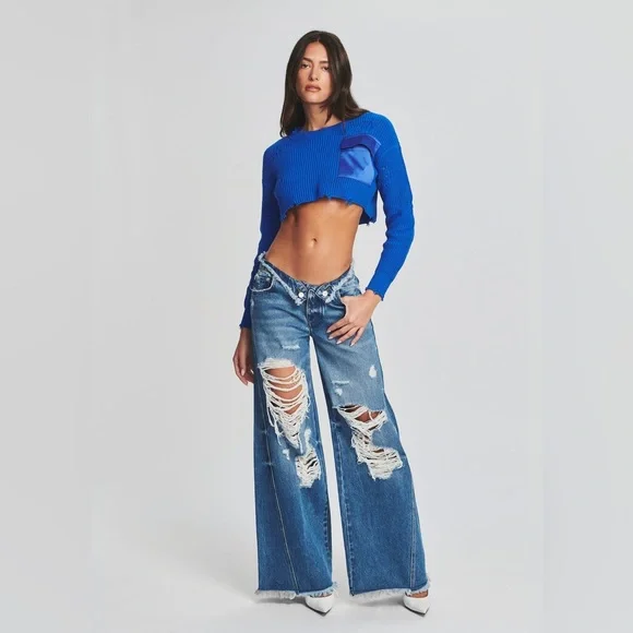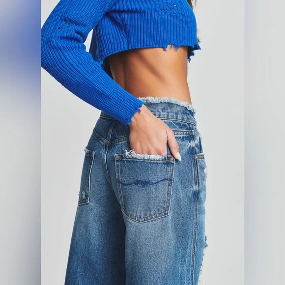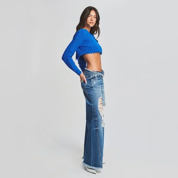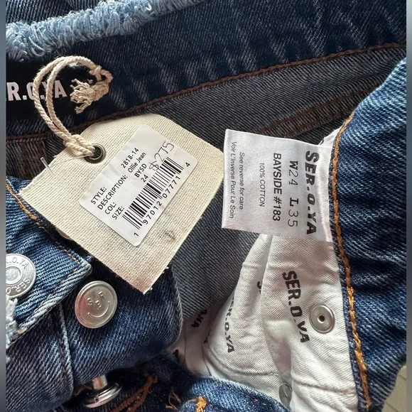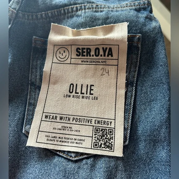 NWT. Size 24. Color is called Bayside.This size is completely sold out onlineThe Ollie Jean by SER.O.YA features a wide-leg, low-rise fit with heavy distressing on the front, a raw hem and waist with fold-over waist detailing. Shown here in Bayside.100% cottonMade in ChinaMachine washButton fly with foldover waist5-pocket stylingFrayed waistband and hemIntentionally destroyed areas throughout20" at the knee breaks to 24" at the leg openingRevolve Style No. SERR-WJ21Manufacturer Style No. 2818-14SER.O.YA is a ready-to-wear brand founded on the intention to create feel-good pieces for everyone. The New York-based brand prides itself on its ability to create effortlessly cool and timelessly luxurious designs. Consistently blurring the lines between masculine and feminine, SER.O.YA continues to champion individuality within each new collection. Shop here for the latest collections from Retrofête's sister brand SER.O.YA!