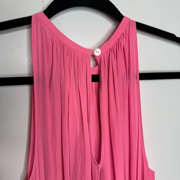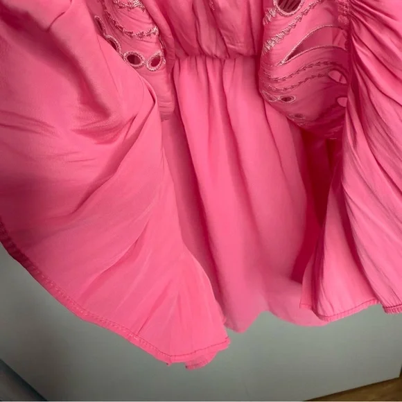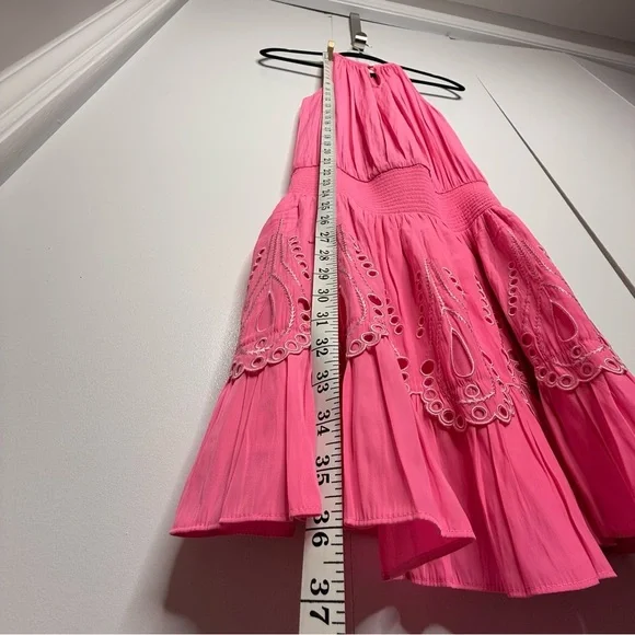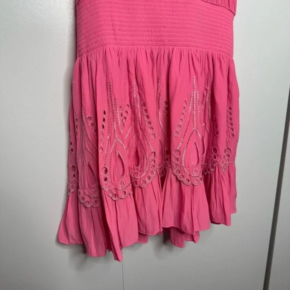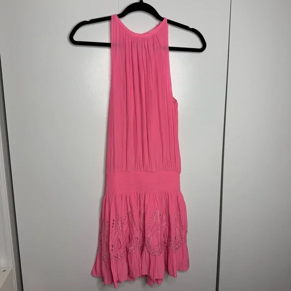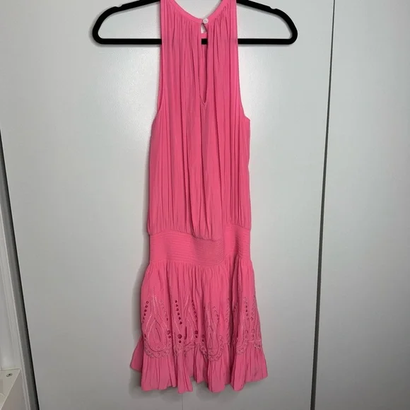 Ramy Brook - Tilly Smocked Mini Dress high neck pink eyelet - XS NWT- gorgeous!!!- smocked waist- button neck closure- stock photo color is a bit lighter-skirting is lined- see photos for approximate measurements Note: Thank you for taking the time to check out my listing. Settings on different devices may distort color. Product photos are taken in a lighted room with a ring light. I document the packaging process for all my items to ensure transparency and to safeguard against potential disputes or discrepancies.Always open to exploring offers on my items! 😊