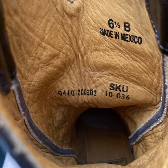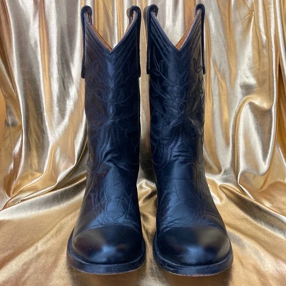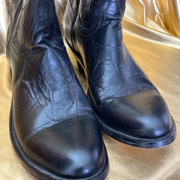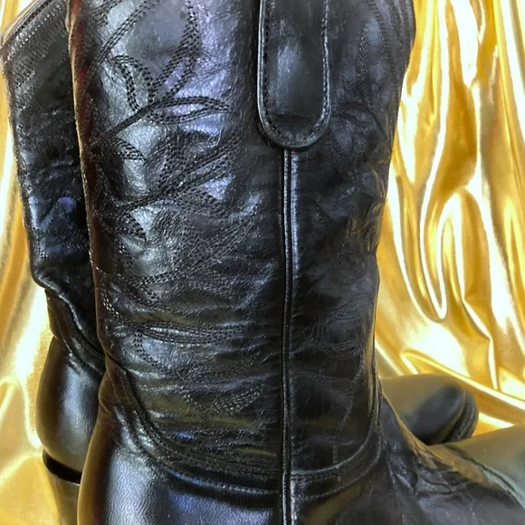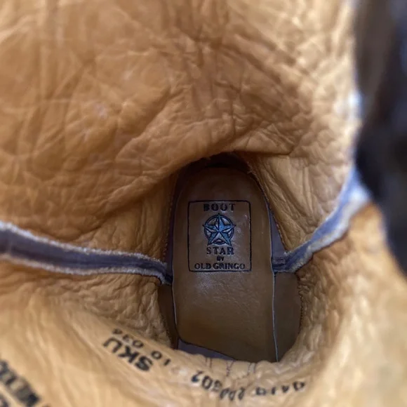 Womens Boot Star Old Gringo cowboy boots. All black leather and black thread.Only worn twice and in Excellent pre-owned condition.They haven't been broken in yet.Purchased for $500 15 years ago and they have just been sitting in my closet.Hoping these will go to a good home to someone who will get a lot of use out of these beautiful and extremely well made boots.These are a size 6.5", but can fit a size 7.The leather is stiff and hasn't been worn in yet, so it's a tight squeeze to get it in, but once they are in (wear a thin sock), they're good!10" shaftDoes not come with box.