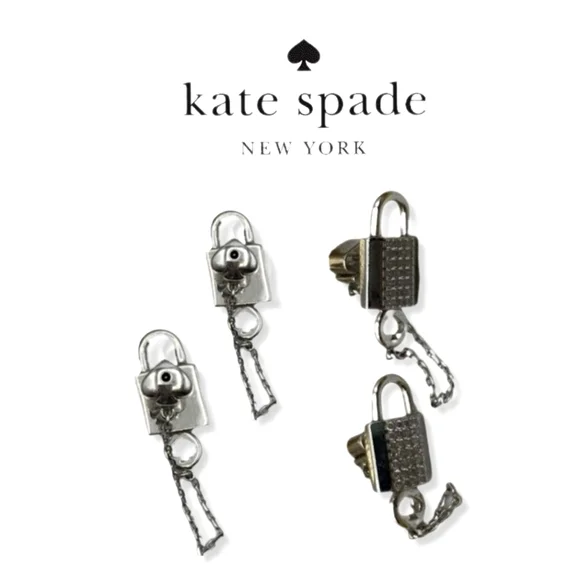 Stylish Pave Padlock earrings. Unique design with chain detail.The image shows a pair of Kate Spade "Lock and Spade" earrings. These silver-tone earrings feature a padlock pendant with the brand's signature spade cutout. Some versions are embellished with cubic zirconia. They have stud closures and a small chain detail.